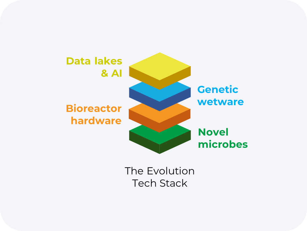 Our PI toolbox is the launchpad for expanded development of our Evolution Tech Stack: a full stack solution that completely unlocks the power of non-intuitive microbe optimisation through interdisciplinary innovation:
